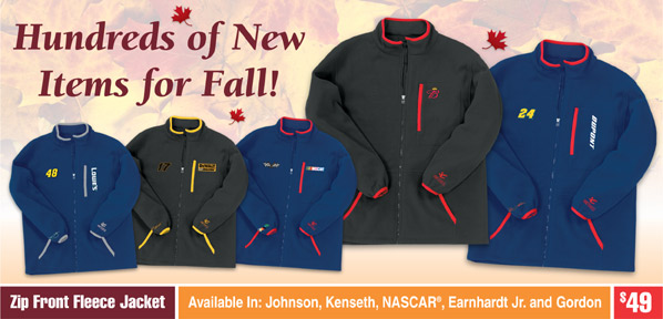 Zip Front Fleece Jacket - $49Soft, cozy fleece jacket with a full zip front. Three front pockets with contrasting team colors. Official driver embroidery on the front. 100% non-pill polyester fleece. Generous fit.